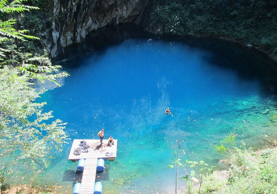 Uma das atrações naturais mais impressionantes da região — uma dolina (cavidade natural) com um lago de água cristalina, de cor que varia entre azul-turquesa e verde-esmeralda conforme a estação do ano. Durante a seca (maio a setembro), a água costuma ficar mais azul. A profundidade é enorme e, em mergulhos, ninguém chegou ao fundo até hoje. A trilha até lá é leve (~850 m), mas tem uma escadaria de mais de 150 degraus para chegar à água.